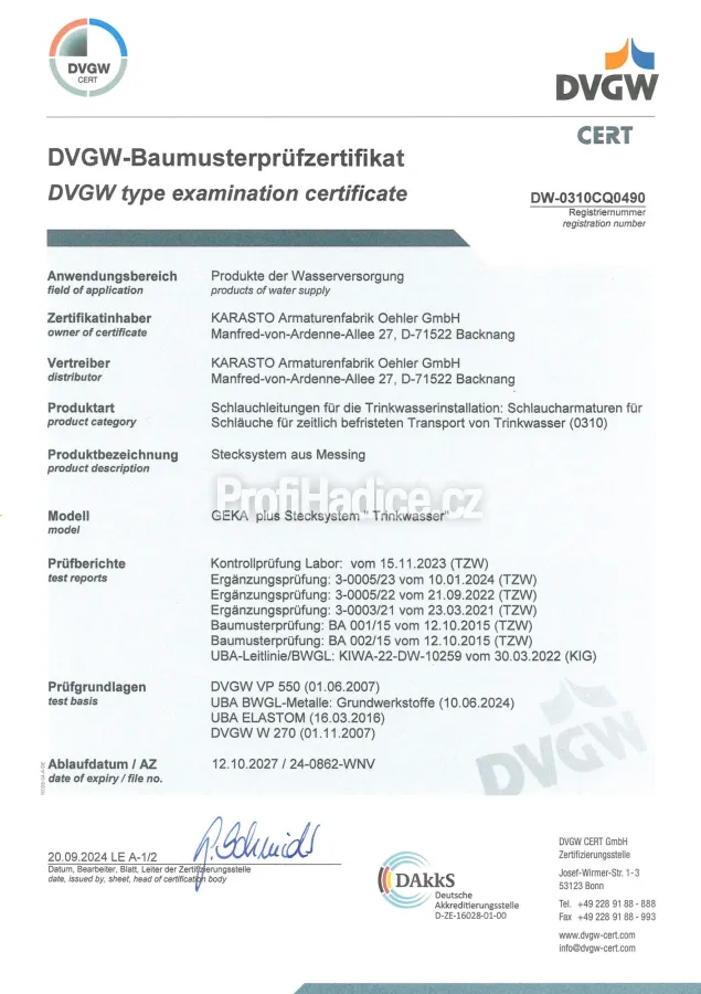 Koncovka pro hadici na pitnou vodu, vhodná pro kempy a karavany, trhy, prodejní vozidla, dětské letní tábory. Certifikace DVGW, registrační číslo: DW-0310CQ0490.