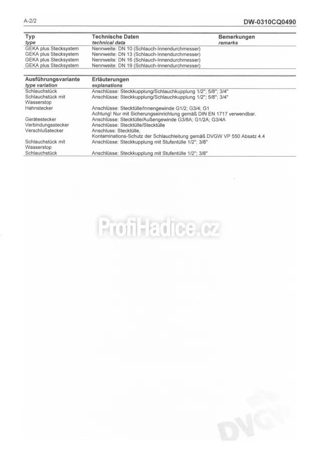 Koncovka pro hadici na pitnou vodu, vhodná pro kempy a karavany, trhy, prodejní vozidla, dětské letní tábory. Certifikace DVGW, registrační číslo: DW-0310CQ0490.