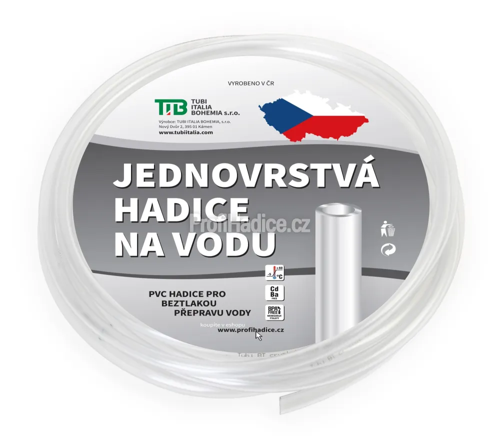 Čirá průhledná PVC hadice bez textilní výztuže pro beztlakou přepravu vody a vzduchu. Pracovní teplota -5°C / +60°C.